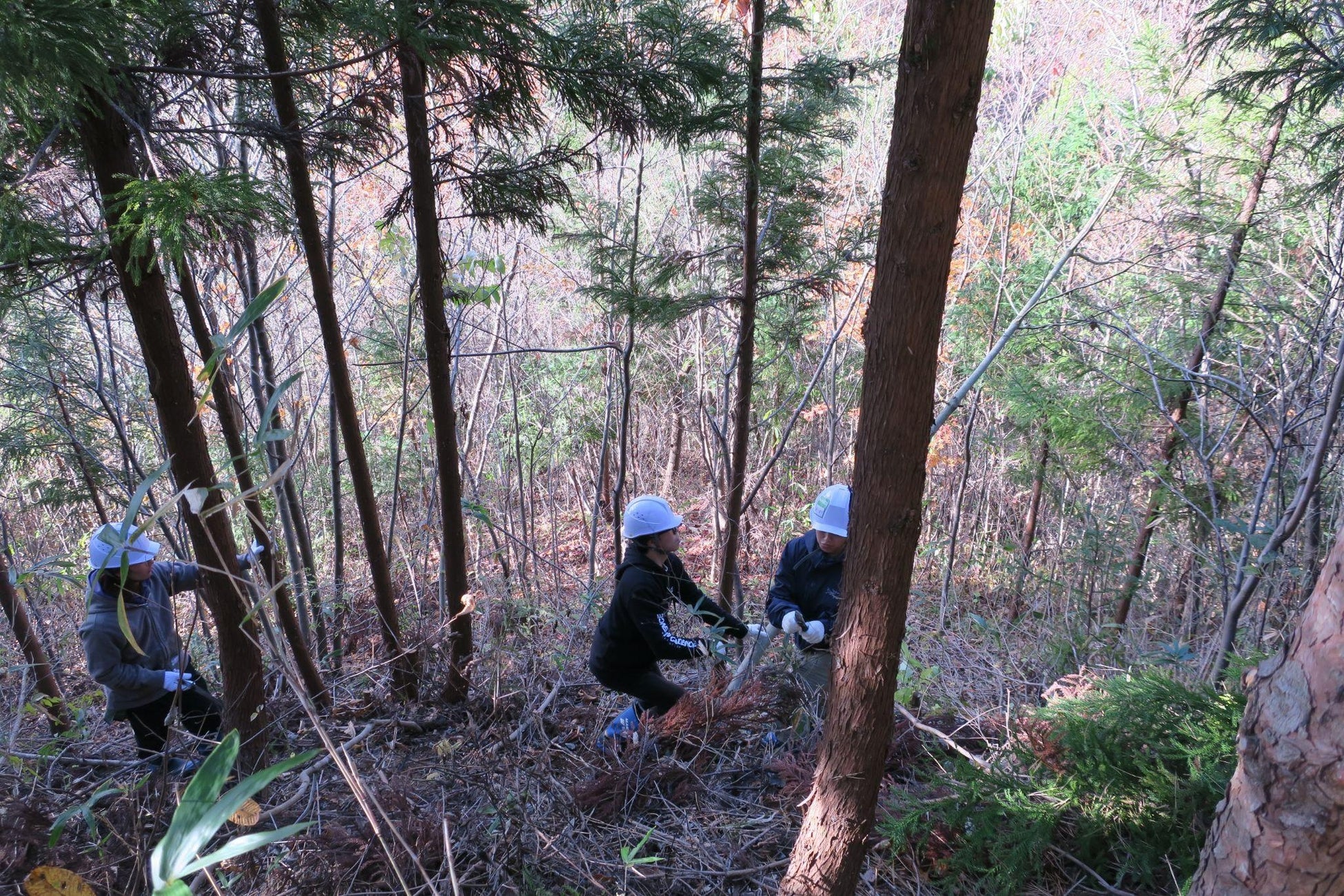 その後、森林整備をする森へ入りました。森では節が多い木材は価値が下がってしまうこと、除伐を行い森に十分に日光が入るようにしなければならないことなど製材所での見学の内容を実地で体験しました。実際に参加者はのこぎりを手に、枝打ちや除伐を体験。参加者の一人は「森林整備の重要性や大変さがわかった。枝打ちや除伐に無心に取り組んであっという間だった。大学の友人にもぜひ体験してもらいたい」と語りました。