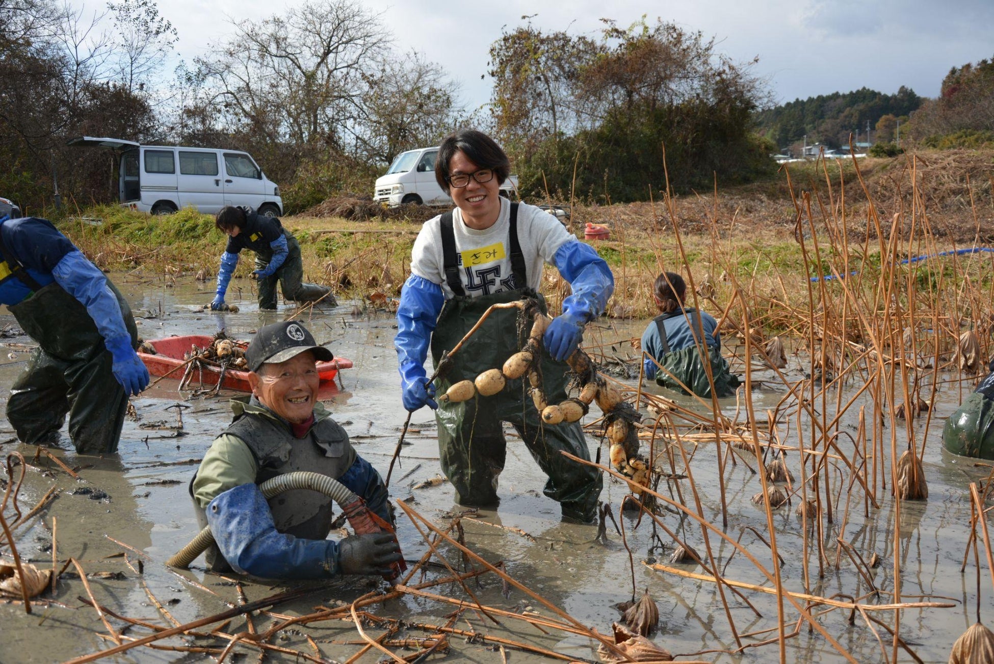 一方、B班は地元特産の伊豆沼レンコンの収穫体験を実施しました。地元の農家さんの元を訪れ寸胴に着替えて泥の中のレンコンを探索。参加者は泥だらけになりながら楽しんでいる様子でした。収穫したてのレンコンを炙ってほおばるとその美味しさに多くの参加者が感動していました。