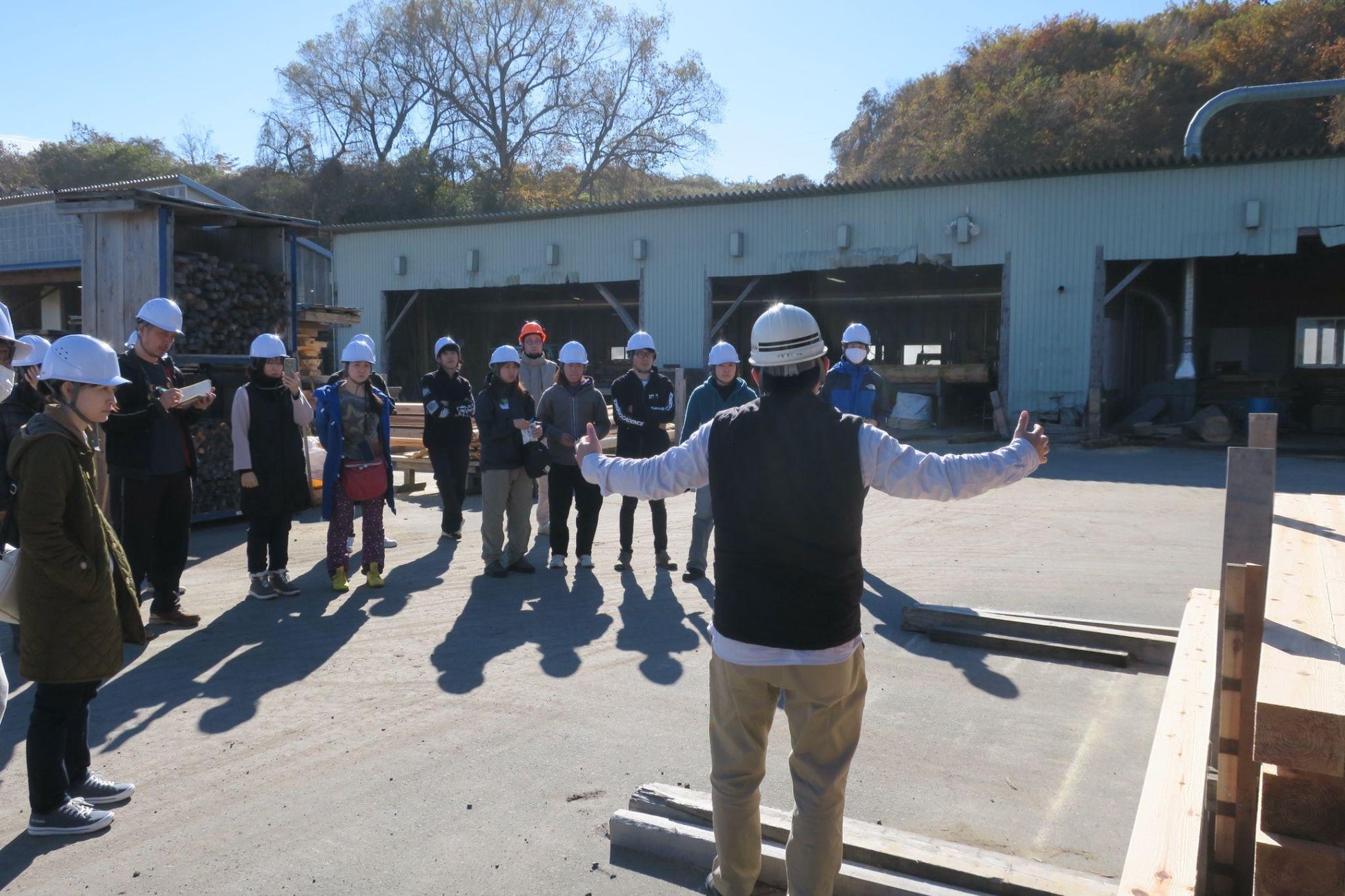 11月21日(木)、モニターツアー1日目の朝、くりこま高原駅に集合した参加者はまず、株式会社KURIMOKUの製材所を見学しました。KURIMOKUでは、木を丁寧に燻煙することで防虫効果や耐久性を高め、木材本来の力を活かした高品質な製材を行っています。参加者は普段見ることのない製材所の風景に興奮するとともに、製材所ならではの木材の豊かな香りに驚いている様子でした。
