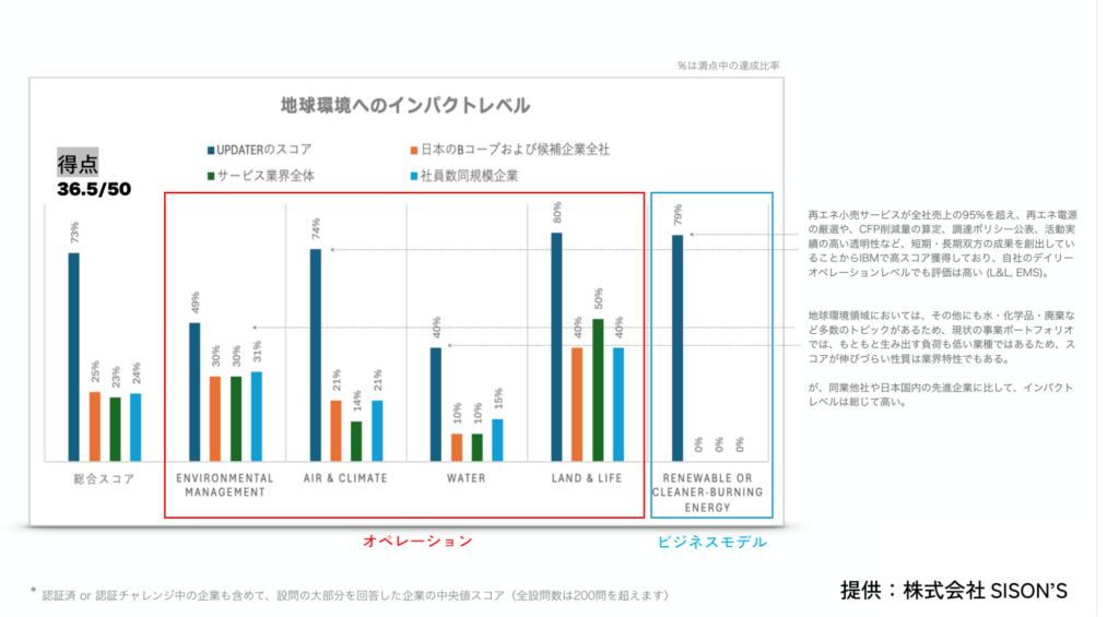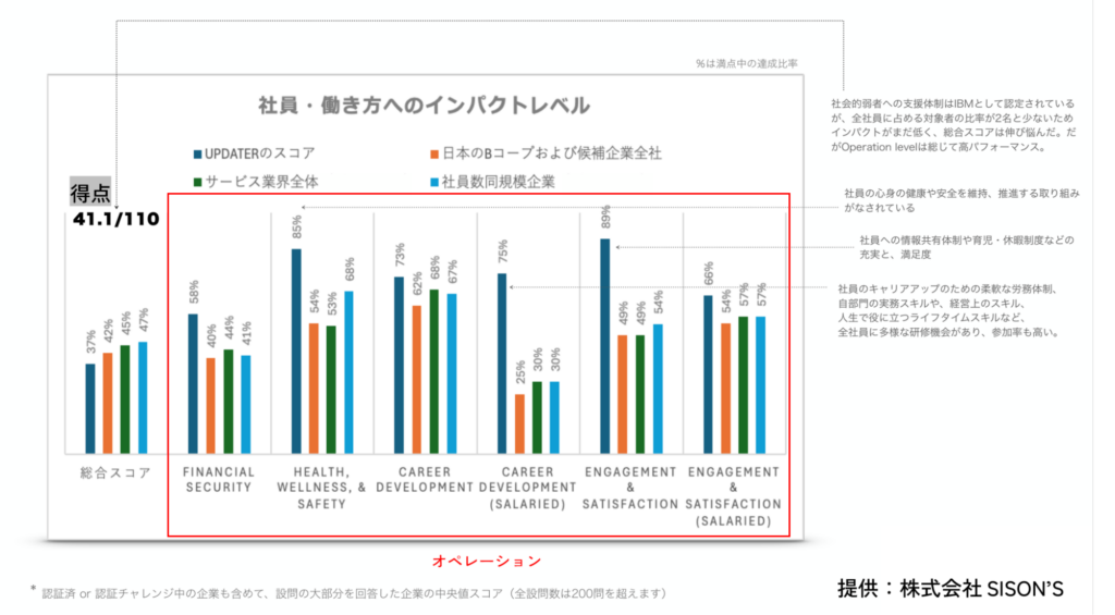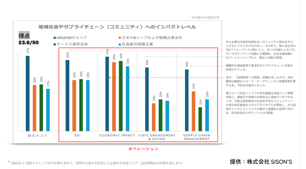 オペレーションレベルでの実効性:オフィスや日々の事業活動における環境マネジメントシステム実践において国内B Corp認証企業の平均を上回っています。