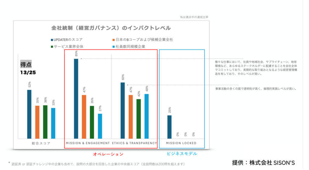 ガバナンス領域では、企業がインパクトをもたらすステークホルダーを総合的かつ客観的に見据えて、透明性を持って倫理的な経営を実践しているかが評価されます。UPDATERの特徴は以下の通りです。